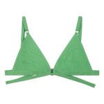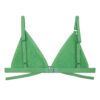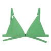 Triangle bra in green color, made in a knitted fabric with ribbed texture. Features a small brass ring in the center of the front. An additional decorative strap is attached to the center ring.